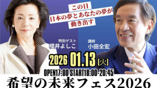 〜 2026/01/13 〜 希望の未来フェス2026 大人世代から子供世代まで必見!本イベントは、社会教育家として全国で「志と希望」を説き続ける小田全宏が、「国家の基本方針」「国家デザイン」を提示し、日本の未来に希望を持つための具体的な道筋を語る場です。さらに特別ゲストに、ジャーナリスト「櫻井...